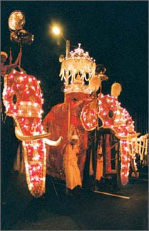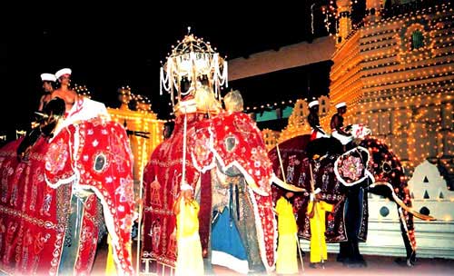 The Perahera is held according to some rituals coming down from traditions. They are known as ‘Esala-keliya'. This festival begins with the installation of ‘kapa' in each Devale. According to the ritual, for five days after installation of kapa, the kapuralas of each devale take it around every evening in a procession, accompanied by music and drumming and along with flag and canopy bearers and spearmen, and the sacred emblem of the gods.' This is known as the Devale Perahera. The Randoli Perahera begins on the 5th day. This is a lengthened version of the famous Kumbal Perahera. Palanquins of the four Devales which contains ornaments of the goddess, pitcher, and the sword are added to the Randoli Perahera. On the full moon day, this Perahera reassembles to go to Asgiriya temple, where the casket is placed. Then Devale Peraheras return to their Devales. Again, in the night, the Devale Peraheras make their way to the water-cutting site at the Getambetota. At the river, the ‘kapuralas' of the devales, go in a decorated boat, to some distance in the river. At this place, each ‘kapurala' slashes the water with the sacred sword and collects a pitcher full at the place where the sword touched the water. This water will be stored in their Devale for one year, and will be put back into the river, next year at a similar Ceremony. After seven days from the day Perahara, the ‘Waliyak-netuma', a shortened form of ‘Kohomba-kankariya' is performed at the Vishnu devalaya, along with masked dancing. On the seventh day, the Esala festival will be declared as over. The people of the ‘balibat' caste, who are sorcerers and exorcists, were the dancers in the Perahera during the days of our kings. It was a form of ‘Rajakariya' (duty) to the king. This time the Kandy Esala Perahera will be held in a grand style and will be a testament that Sri Lanka is ready for tourism after the peace! Courtesy: The Sunday Observer of Sunday, 25 July 2010