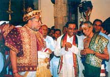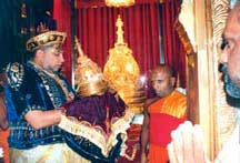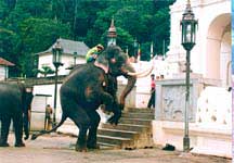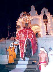 Due to changed star configurations, after many years of conducting the Esala Perahera in the months of June or July, this year's (2003) procession will revert to its namesake month of Esala (or August). Four hundred and ten years have passed since the Dalada or the Sacred Tooth Relic came to occupy the present Dalada Maligawa. Prince Danta and Princess Hemamala brought it to Sri Lanka during the Anuradhapura Era from when it became imperative that the King of the Land must be the guardian of the "Dalada". This living memory of Lord Buddha, considered as the most precious possession of Buddhists the world over, has stayed miraculously unscathed through many human-made catastrophes such as wars and foreign invasions including the bomb attack a few years ago, although its residency has passed through many temples such the ones found in Arattana, Yapahuwa, Polonnaruwa and Isurumuniya, to mention a few. For residents of Kandy, Dalada Perahera is an annual event. Tourists from all over the world come to Sri Lanka just to be eyewitnesses to the dazzling spectacle. Tour agents grab all rooms in hotels and guest houses well before the Perahera and even private homes keep a room in readiness for tourists. In the final Randoli stages of the Perahera, one could hardly find a vacant room in Kandy and the few available could charge as much as Rs. 7,000 per night. While the Perahera attracts a large number of international tourists, a regular feature is the traditional journey made by rural men, women and children. For them, this annual pilgrimage is a celebration looked forward to for ages. They come days ahead and reserve their lake side space by spreading a tarpaulin, waiting for the perahera to begin. In recognition of these rustic pilgrims, the Kandy local authorities have been restrained from erecting seats along the lake rounds, as they do in other parts of the Kandy city, the cost of which changes with the viewing advantage. As in the last year, the on-going peace process is expected to bring in throngs of Northern and Eastern tourists to Kandy, uniting peoples from two ends of the country in common appreciation of a common culture, native to and shared by all who inhabit this island, as a heritage of Sinhala, Tamil, Muslim, Burgher or any other race living here. Though the modern Lankan culture has much to do with the play of market forces with the profit motive topmost, the essence of Dalada Perahera continues to remain unaffected and indifferent to the social changes around.