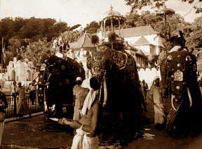 by Godwin Witane Relic worship in Buddhism is as old as Buddhism itself. King Asoka of India built stupas enclosing relics of the Buddha and the first stupa in Sri Lanka built by King Devanam Piyatissa enclosing the relics of the Buddha including the right collar bone was Thuparama. The main object of the Kandy Perahera is paying homage to the "Danta Dhatu," the living embodiment, a part of the Holy Body of Lord Buddha which the devotees of Sri Lanka are fortunate to possess. The Buddhists of Sri Lanka are in an envious position that they have the opportunity of prostrating before the Tooth Relic as much as they wish. This will be the most delightful memory in their lives so long as they live on this earth. When a child worships his parents the usual blessing bestowed on him by the parents will be the wish that he would one day behold the Buddha in person and attain Nirvana, "Budun deka Nivan dakinna". Warm Affection The Sacred Tooth Relic was brought to Lanka during the reign of King Megawanna (325-377 A.D.) by Prince Danta and Princess Hemamali from India in 371 A.D. In recorded history precursors of the present perahera carrying the Danta Dhatu was the procession which carried the Tooth Relic to Abhayagiri Vihara built by King Valagambahu. The Chinese monk Fa Hein in the 3rd Century A.D. describes how the Sacred Tooth Relic was publicly exposed on sacred days with gorgeous ceremonies and carried in procession through perfumed and decorated streets. History records that with the dravidian conquest the country was unstable and the fate of the Tooth Relic rested on the devoted Buddhist Monks who guarded it with warm affection. King Udaya IV (946-954 A.D.) had to flee the Capital with the Tooth Relic for safety on the face of the Cholian invasion but they were unsuccessful in capturing it. It was taken to the South of the country. King Elara ruled for 40 years. The Tooth Relic was brought back to Polonnaruwa by King Vijayabahu I. It was safe in the hands of King Parakramabahu the Great (1153-1186 A.D.) and King Nissanka Malla (1186-1196 A.D.). When the usurper Magha invaded Polonnaruwa the Tooth Relic was taken to Kotmale. From Kotmale it was taken to Dambadeniya, and in turn to Kurunegala, Gampola and Kotte. The Tooth Relic was possessed by successive kings. It was believed that whoever possessed the Tooth Relic had the divine power to govern the country. At Kotte it went into the hands of the Portuguese. They lost no time in sending it to Goa in India and get it destroyed. However it was a fake one replaced by the devoted monks. Golden Casket The actual Tooth Relic was in the hands of the devoted monks and was passed on to the Sinhalese kings. During the reign of King Rajasinghe I of Sitawaka this apostate king when he embraced Hinduism the people removed it to Delgamuwa. When Wimaladharmasuriya I (1582-1604 A.D.) ascended the throne of Kandy, he brought it to Kandy and was enshrined in a golden casket. The present Dalada Maligawa building is the work of King Narendrasinghe (1707-1739 A.D.) The Octagon was built by King Sri Wickrama Rajasinghe (1798-1815 A.D.) along with the Kandy lake. When Major Davy of the British invaded Kandy the Sacred Tooth Relic was taken to Meda Maha Nuwara and brought back to Kandy after the defeat of the British troops. Then there was rejoicing and the King Sri Wickrama Rajasinghe himself paraded in the procession riding in a royal carriage. It is a known fact that the Sacred Tooth Relic had no fixed abode for about 15 Centuries unlike other relics that are enshrined in dagobas. In Sri Lanka people worship Vishnu not as one of the Trinity Brahma, Vishnu and Siva but as the guardian deity of the island whose sacred duty is to see to the welfare of the Buddhist Faith. Therefore the Kandy procession is held to honour him. According to the next belief the perahera is held to celebrate the victory of Vishnu over the Demon Asura, the eternal enemy of the devas. The third belief is that the procession at the beginning was started by King Gajabahu (113-115 A.D.) to commemorate his victorious return from the Cholian country in India along with 12,000 of Singhalese captives taken away by the invading Cholian army and an equal number of Dravidians from that country. It is the prevailing belief that the "Demala Maha Seya" only half built situated close to the Gal Vihare in Polonnaruwa is the work of these conscripts. Thereby the origin of the Kandy Dalada Perahera is wrapped in mystery and legend. Year after year through the long centuries this colourful spectacle emerges to portray the annual splendour and religious fervour of the Buddhists. Kandyan Convention The origin of the Kandy Perahera in its present form is the Dalada Perahera followed by four processions devoted to the four gods Natha, Pattini, Kataragama and Vishnu carrying their insignia dates back to the reign of King Kirti Sri Rajasinghe (1747-1781 A.D.). On April 1815 after signing of the Kandyan Convention the Tooth Relic was brought to Kandy in pomp and glory and O'Doily the Governor of Kandy once again commenced the procession carrying the Tooth Relic. On 3rd May 1815 Governor Brownrigg held a procession in Kandy which excelled the processions of the Kandyan Monarchs. In this long procession the place of the King was taken by the deposed Chief Adigar Ehelepola who rode on horseback in the procession. The British now knew that the possession of the Tooth Relic had the authority to govern the country. After the capture of Kandy the Tooth Relic was in the custody of the British but in 1828 the Tooth Relic was transferred to the kandyan Chiefs. During 1915 riots Governor Charlmers banned the Kandy Dalada Perahera however later in 1919 Governor Sir Henry Manning removed this ban considering the peace in the country. The Tooth Relic is held to be the palladium of regal authority. by Godwin WitaneCourtesy The Sunday Observer Features of 3 August 2003