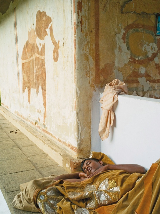 With his elephant nearby, a mahout sleeps in the early morning light.