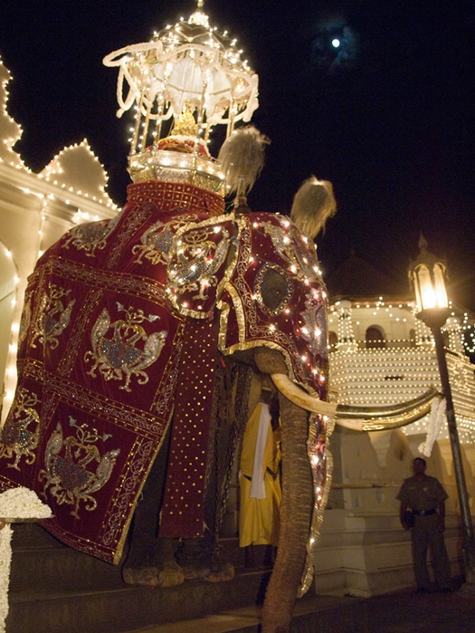 Under the full August moon, a large temple tusker leaves the Dalada Maligawa carrying