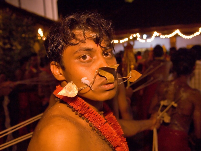 and cheeks with long needle-like rods. The devotees