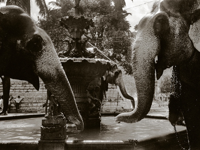 Elephants gathered at the Coffee Planters Fountain in the heart of the city of Kandy.