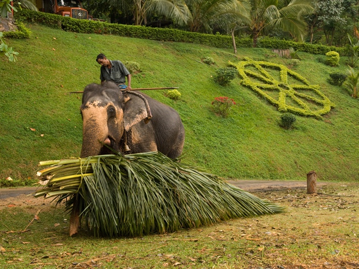 An elephant carries palm fronds near a topiary shaped into the Wheel of Dharma.